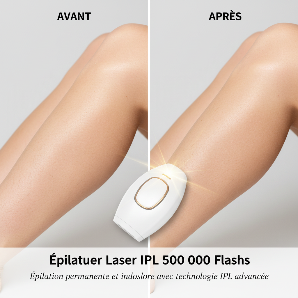 Épilation permanente et indolore avec technologie IPL avancée. 500 000 flashs, 5 niveaux d'intensité. Peau lisse et douce pour longtemps.